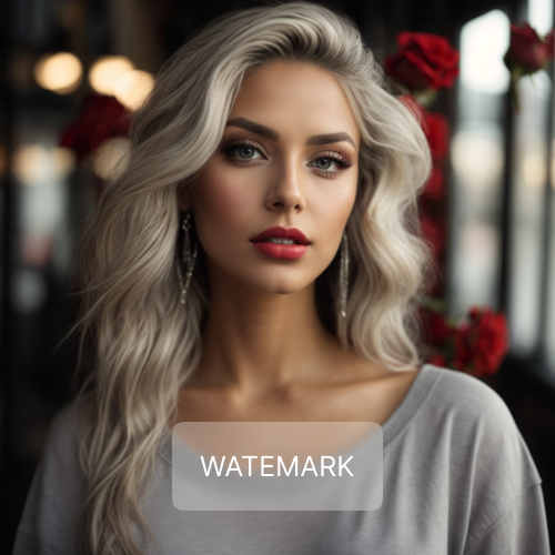 This portrait captures a mesmerizing fusion of strength and allure, as bold red lips contrast with the softness of her wavy hair.