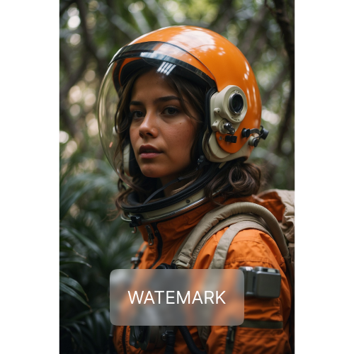 Poised and contemplative, a young astronaut in an orange space suit stands amidst a lush forest.