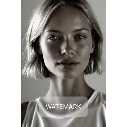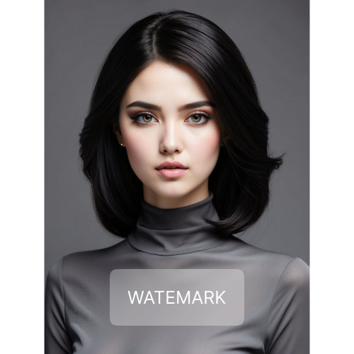 This portrait exudes modern sophistication with a model dressed in a minimalist high-neck top, her dark hair styled in soft waves.